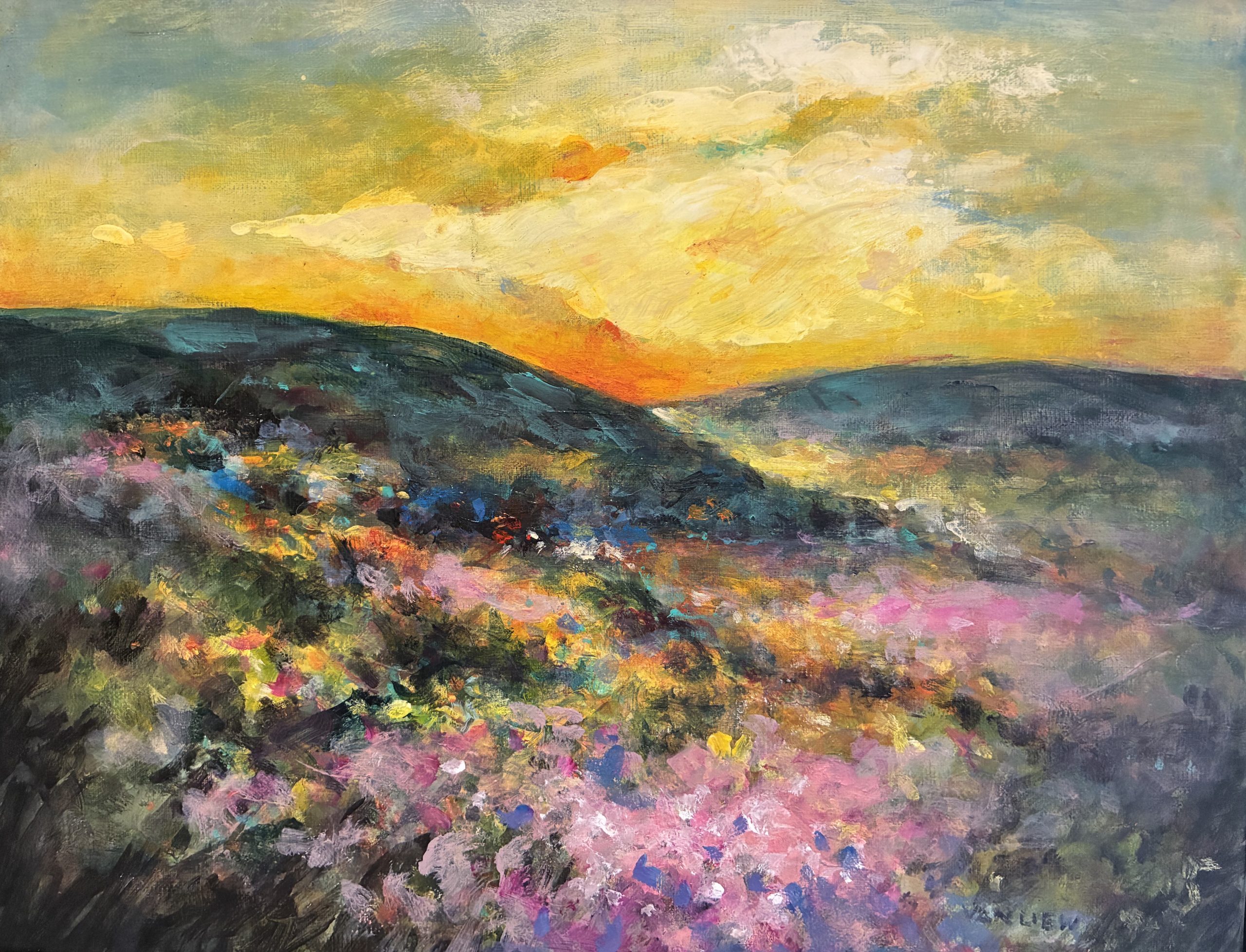 Currently on display are acrylics on canvas of landscapes in Kansas, featuring the Konza Prairie, Cheyenne Bottoms, Tallgrass Prairie, and a scenic drive of Boot hill Road, south of Manhattan.